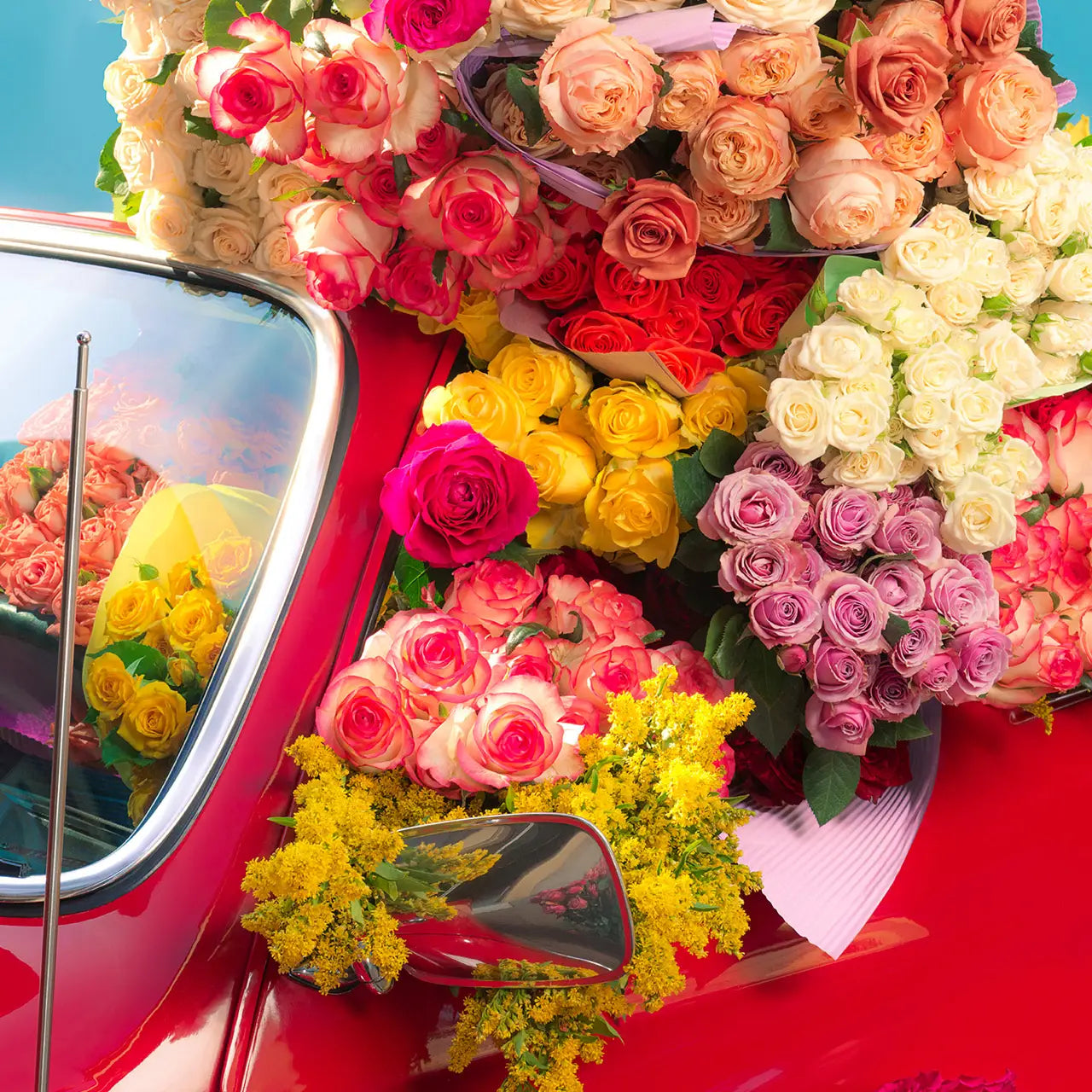 You don’t need rose-colored glasses to see that this puzzle — featuring bunches of many hued florals snuggly stowed in a cherry-red vintage car — is both a visual delight and a great jigsaw.